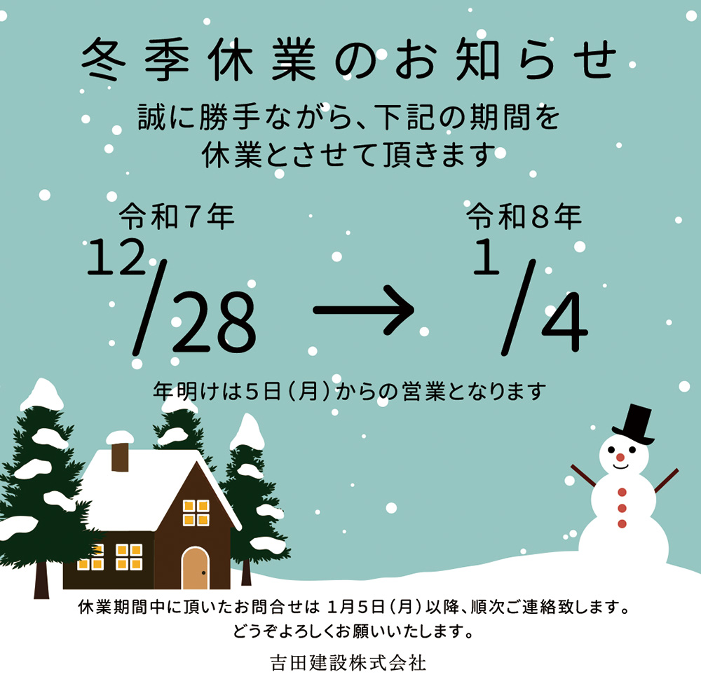【冬季休業期間のお知らせ】 2025年12月28日(日)~2026年1月4日迄 上記期間を冬季休業とさせて頂きます。 休業期間中に頂いたお問合せにつきましては、2025年1月5日の営業開始より 順次ご連絡させて頂きます。 また、現在進行中の工…